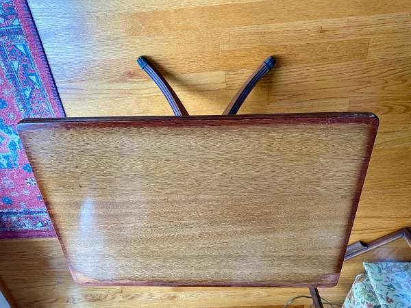 Antique Duncan Phyfe Tray Table is in good condition for its age. Measures 24” x 17” x 19.5” high. Glass top tray comes off. I have a Crochet doily under the glass. You can also put pop ok vintage...