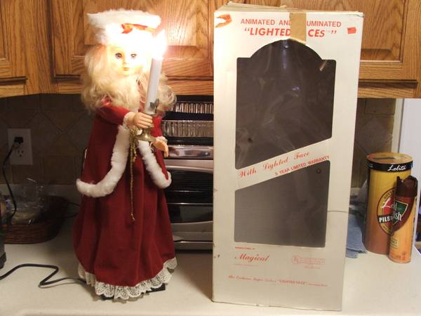3. Also from the 60s, an animated young girl in a nice red velvet cape with white fur trim. Hands and head also move with a candle that lights when the switch is engaged. Dimensions same as Santa. $20.