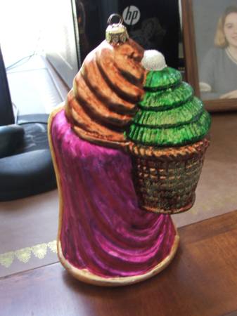 1. Vintage collectable blown glass Santa. This handcrafted and wonderfully painted ornament is in perfect condition. Santa stands (or hangs) a full 8 inches and is 5 inches wide and 3 ½ inches deep. The detailed hand painting is very vibrant. As shown even Santa’s feet are painted in on the bottom. The metal hanger is marked “Radko”, which identifies it as being from the Christopher Radko collection. Radko started hand blowing these collectible ornaments in 1985 and his products are world famous today. $65.