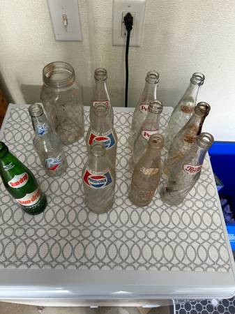 Here is a tub of 11 old soda bottles and one jar. The first $20 bill gets them all in a big Rubbermaid tub included.