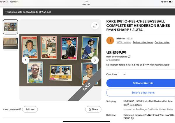 As you can see, it’s a badly off-centered set (the same was the case for the 81 Topps set). I’ve priced it accordingly, and have posted screenshots of two very recent sales of this very same set/condition.
