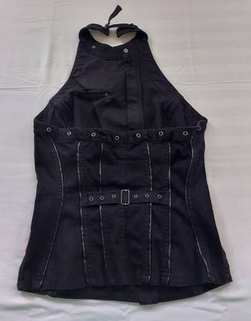 TRIPP Black Halter Adjustable Tank Top with Piping & Gun metal Grommets and Zipper Size XL 14" underarm to hem 18 ¹/²" seam to seam under arm Stretch fibers $25.00