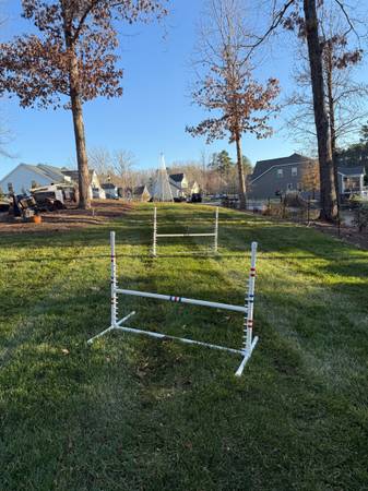 2 Adjustable dog jumps, 1 tire jump and weave poles (23.5'). All in excellent condition. Cleaned and added new red and blue tape. No longer have a dog.