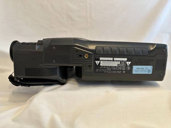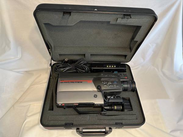 1989 General Electric Camcorder CG-9810 records and plays VHS tape. Includes owner's manual, hard case, and AC adaptor/charger. No battery. Replacement batteries are available online.