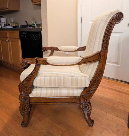Like new condition. High end solid mahogany arm chair. Hand carved details on the arms, legs, and frame. Light beige colored vertical striped fabric. It features removable seat cushions. Very sturdy and durable. Delivery available if needed. Text me thanks.