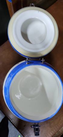I am pleased to offer this vintage Inspirado Biscotti Cookie Jar. It is a hand-painted ceramic jar with an airtight seal, decorated with a coffee cup and coffee beans motif and the word "Biscotti". The jar is made of ceramic and porcelain with a metal clamp. It was produced by the company Inspirado. The jar is a vintage item, with some listings dating it to the year 2000 or 2001.