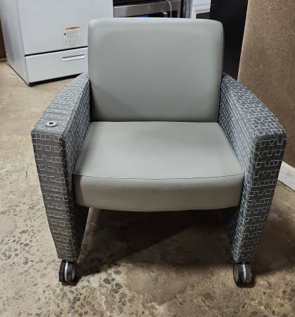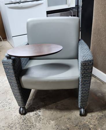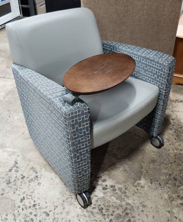I am pleased to offer this Haworth ToDo Lounge Chair. It is a very comfortable and stylish chair for your office or bedroom. It has a oval shaped swivel table top that can go on either side. It just depends if you are right or left handed. The fabric is gray an blue with yellow lines in it and is a vinyl material. And a lighter gray seat and back. It has wheels for easy mobility.