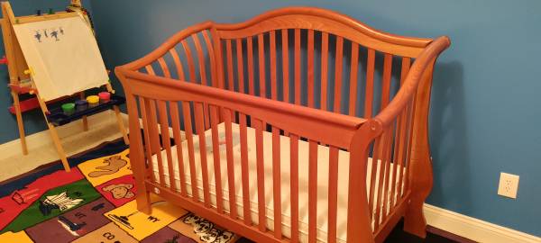 Beautiful, very solid all wood crib made by Pali. Made in Italy. Very high quality. The crib mattress adjusts to two different levels. The higher level makes it much easier to get the child in and out of the crib when the infant is small and can be lowered down when the child grows. This crib will convert to a full size bed after child has grown out of crib. Included in the sale is the crib, crib mattress, bed rails and box spring.