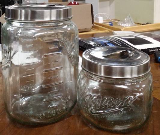 I am pleased to offer these "Mason Craft & More" glass canisters, recognized for their vintage-inspired aesthetic.They are made from durable glass and feature tight-fitting metal lids, some with a pop-up mechanism or clamp-style closure for airtight storage, ensuring freshness. These are pre-owned. With no chips or cracks and would look amazing in your kitchen.