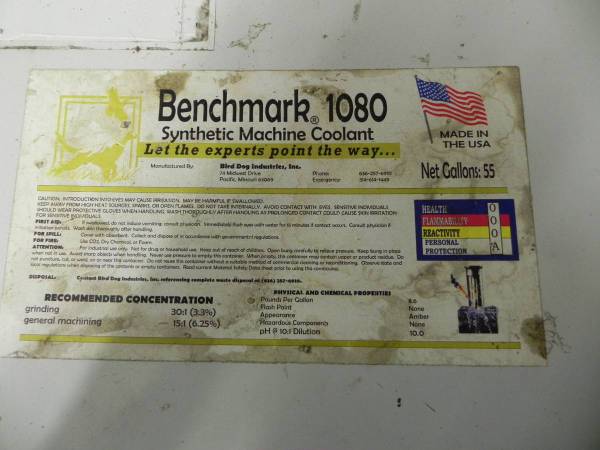 We have a brand new unopened 55 Gal. drum of Benchmark 1080 Syn. Machine coolant made by Bird Dog Industries out of St. Louis, MO.