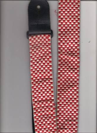 1. Stylish red and white checkered guitar strap with black leather ends.
