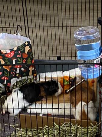 2 males, bonded looking for a good home. They are handled daily and are doing great bonding with humans. Re-home Fee is $100.00 and will come with their house, food, bowls hay and all their toys and fleece bedding. They are long haired Abyssinian Guinea Pigs.